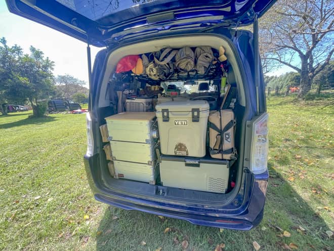 キャンプギアの積載が完了したら、最後にポータブル冷蔵庫を車に積載します。