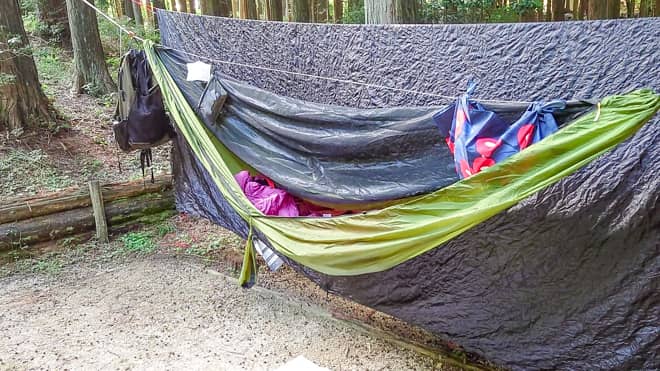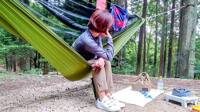 腰痛持ちの筆者でもテント泊より心地よく眠る事ができました。ちなみにハンモックで寝ると違和感のある方は、ハンモック本体に対して体を斜めにするとフラットになるので寝やすいと思います。