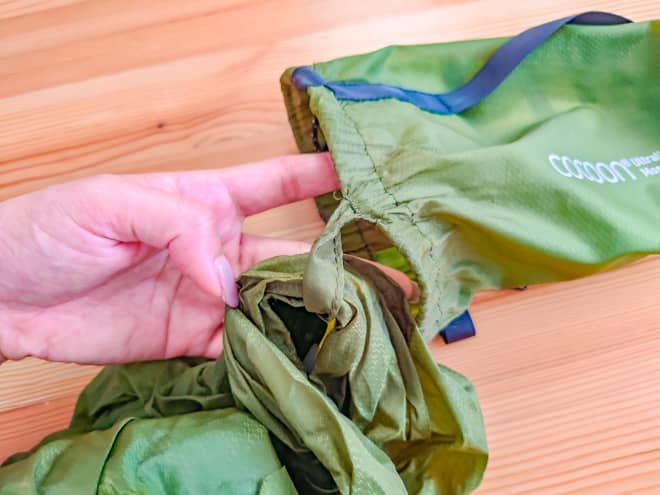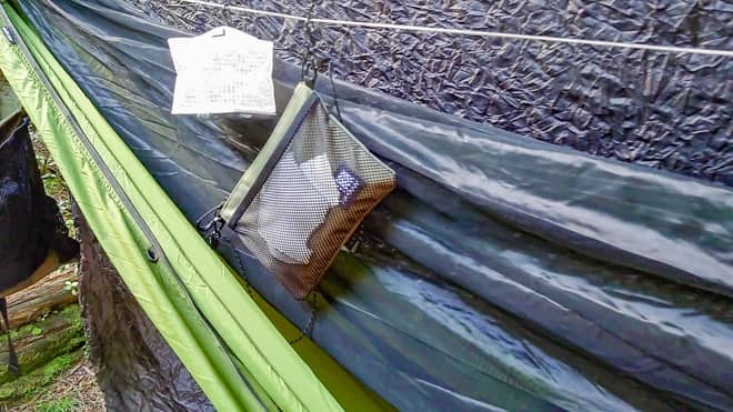 これも重量を考慮してかもしれませんが、小物を入れるポケットは付いていません。外側に付いている収納袋をポケットとして使うか、ハンモック内で使う物はリッジラインに吊るせば良いのですが、スマホを入れられるくらいで良いのでポケットが付いていれば便利だったなと思います。