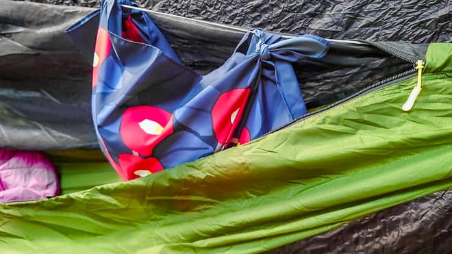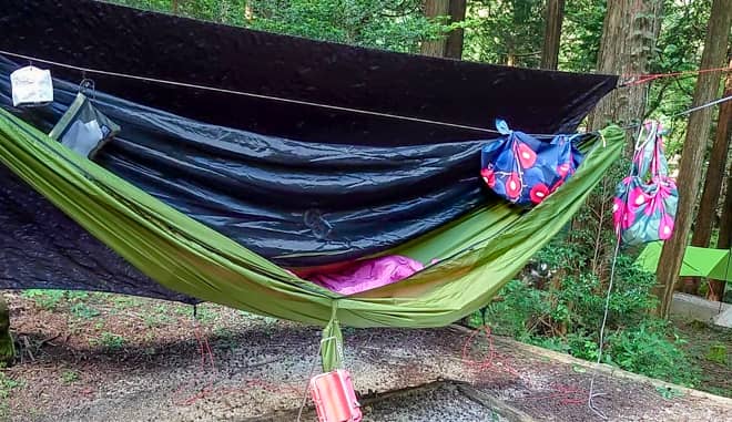 筆者がハンモック泊をする時は、撥水風呂敷の両端をリッジラインに引っかけて結んで収納ポケットとして使用しています。雑多な物をポイポイ放り込んでも目隠しになるので重宝しています。