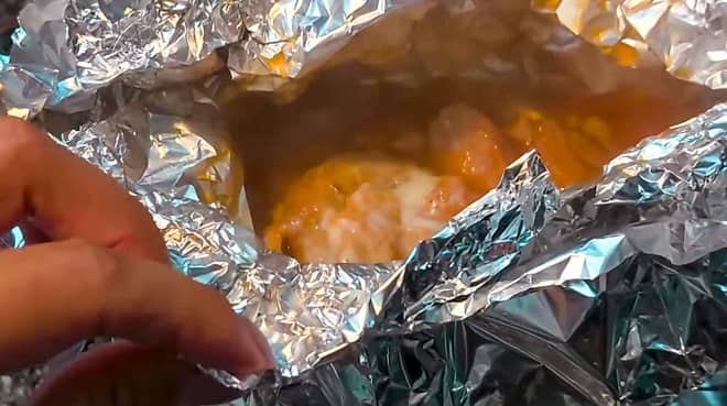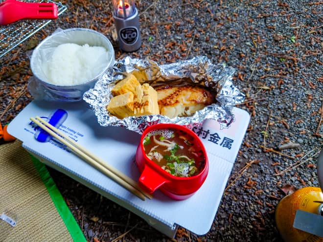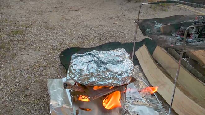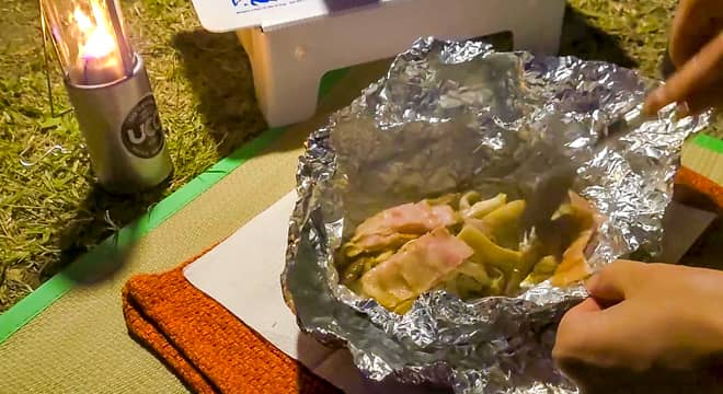 食材を包んで焼いてしまえばフライパンが不要!ソロ用キャンプ飯ならアルミホイルだけで十分調理できます。そして、アルミホイルで調理するとそのまま食器として使用もできるし洗い物も出ません。軽量化の面で言えば一石三鳥ですね。
