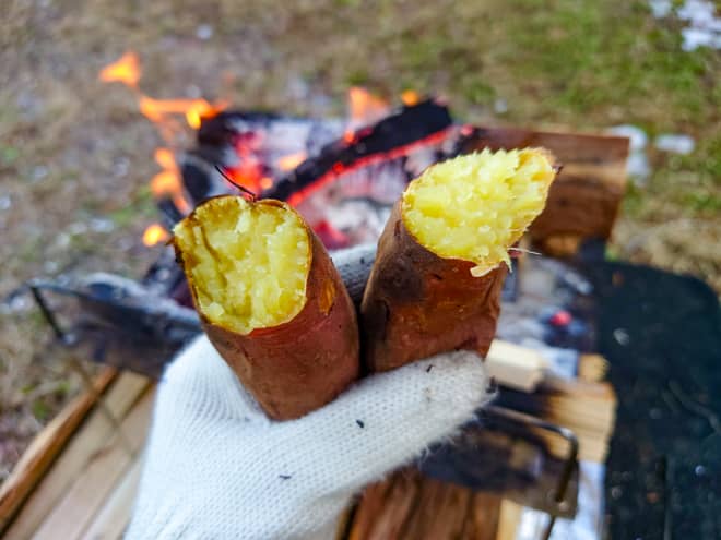 火加減が難しいですが、なるべく熾火付近に置いてまんべんなく火が通る様に向きを変えながら火を通します。30分を目安に様子を見れば失敗は無いと思います!
