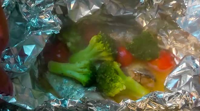 オイルサーディン缶をオイルごとアルミホイルに入れてプチトマト、ブロッコリーに黒瀬スパイスと焼肉のタレ(塩味)少々で味付け。筆者はニンニクを入れ忘れたのですが、ニンニク必須です!