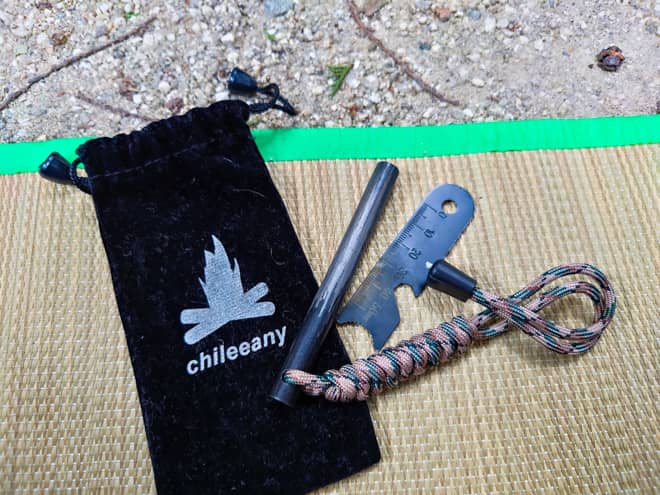 最初は100均の小さいものを試したのですが、初心者の筆者には火花を散らすのは難しい。そこでこのロッド部分が100×10mmの極太タイプで素材にフェロセリウムを使用してあるファイヤースターターを購入。初心者の筆者でもすぐに着火できる様になりました。