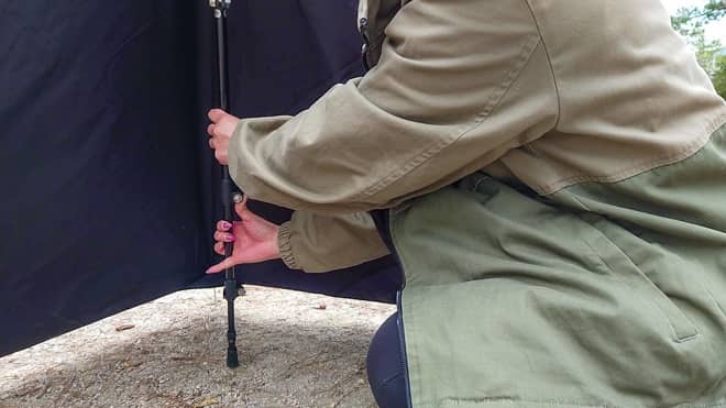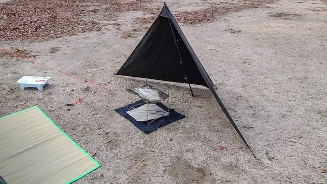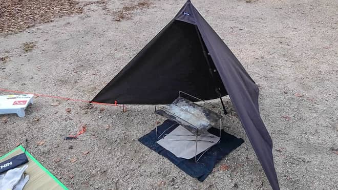 これは陣幕全般に言える事ですが、一度設営すると後から動かすのは面倒です。よくある金属製のリフレクターなら置くだけなので位置を変えるのは容易ですが、陣幕はペグの抜き挿しが必要。設営後に少し動かしたいなと思っても動かすのが面倒です。さらに三角に張るワンポールなので、慣れない間は位置決めが少し難しいかもしれません。