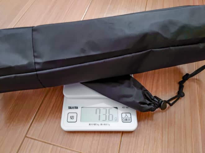 メーカー公式では650g(Mサイズ)との記載でしたが、筆者が自宅で確認したところ収納袋込みで736gでした。ただ、このサイズ感の陣幕は軽量でも1kg以上になるのがほとんどなので、700g台でもかなり軽量!筆者が探した中では最軽量でした。