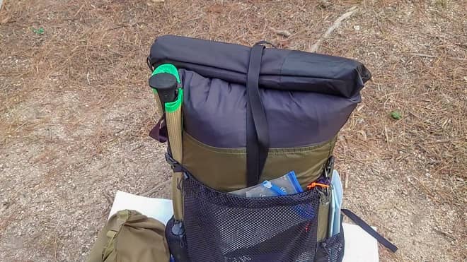 筆者の場合はバックパックの上に外付けしましたが、筒状なのでサイドポケットに入れたりするのもアリです。