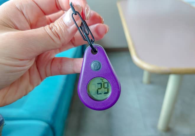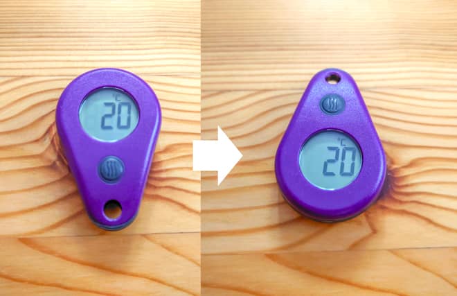 そして人気のある理由はこんなに小さいのに高機能であること。まず、バックライト付きなので夜間でもバッチリ確認できる。さらに自動回転ディスプレイなので上下どの向きにしても気温が確認できます。(9℃?6℃?と間違えることが無い!)