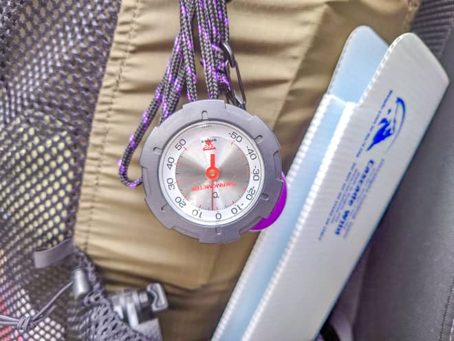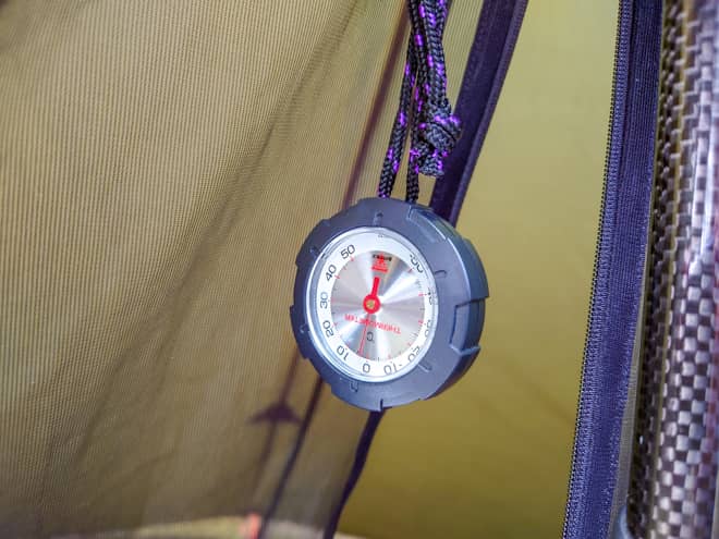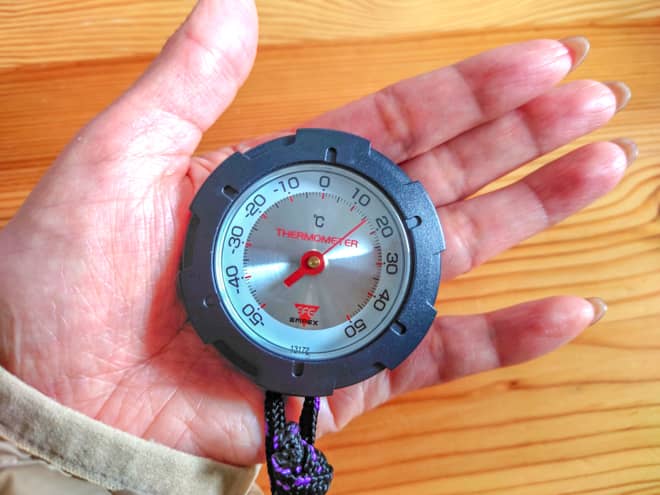 温度計に関しては目盛りが5℃単位と細かくは確認できないのですが、-30℃~50℃までと広範囲の温度を測定できます。そして本体がカラビナ形式になっているので、何処にでも引っ掛けやすいのは嬉しいポイント!