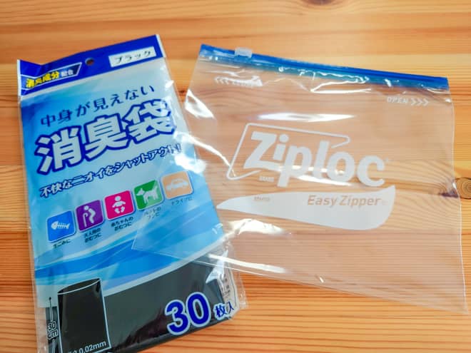 また、筆者の場合ですが、男性スタッフしかいない小規模キャンプ場では使用済みナプキンを捨てていくのは気が引けるので、その場合も持ち帰るようにしています。その際はジップ付きのビニール袋をナプキンと一緒に持ち歩き、使用済みナプキンの臭いが出ない様に空気を抜いてジップ付きのビニール袋に入れています。百均ショップ等で臭いが漏れないビニール袋も販売されているので併用すると更に安心です。