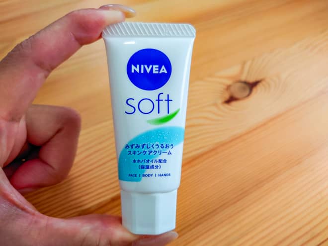 筆者がキャンプの時に必ず持って行くのがダイソーで販売しているニベアソフトスキンケアクリーム。20gと小さいチューブなので持ち歩きにぴったりサイズ。しかも100円!全身に使用できるので、顔の保湿以外にもハンドクリームとしても使用できてコスパ良し!1泊くらいならこれくらい簡素化しても肌への影響はほぼ無しです。