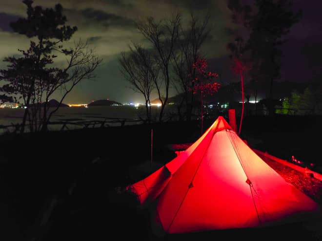 これは軽量テントを使用するキャンパー限定になりますが、薄いナイロン素材のシングルウォールテントの中で灯りを付けるとけっこう透けます。テント内で何をしているか外に丸見えです。
