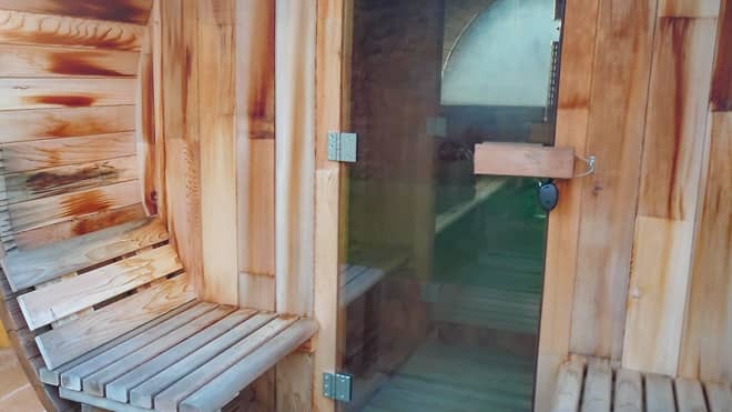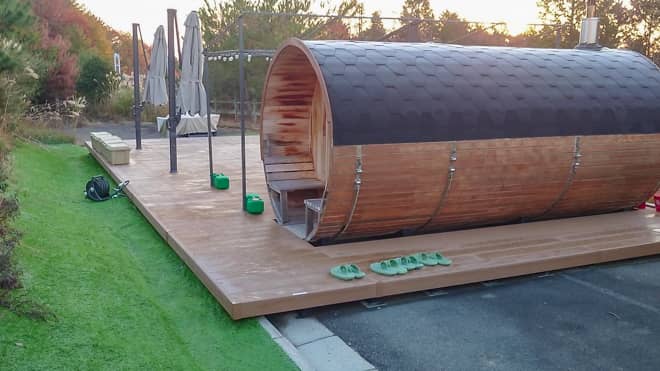 オシャレな樽型で余裕をもって大人4人が入れそうなサイズ感でした。ウッドデッキに設置されていて外に水風呂もあります。キャンプとのセットプランもあるのでサウナ好きの方はたまらないと思います。