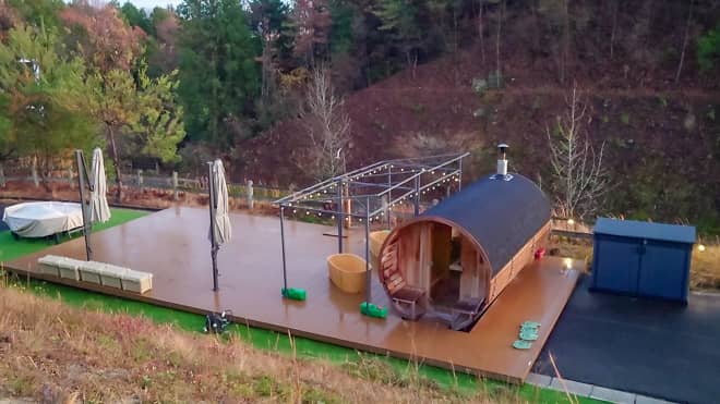 キャンプサイトのすぐ下にこれまたオシャレなサウナがあります。樽型デザインのサウナで大人4人くらいは余裕で入れるサイズ。水風呂も外のデッキに設置してあるので木々を眺めながらととのうことができます。