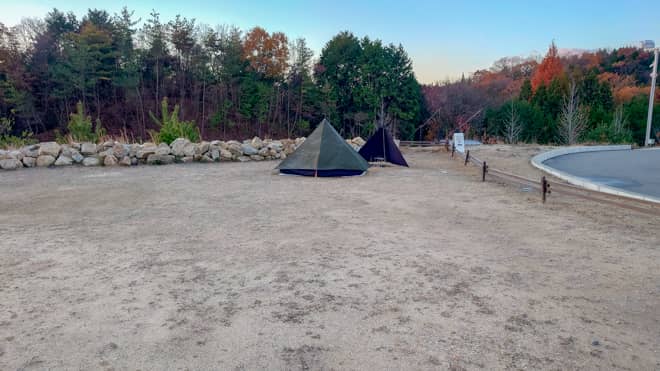 サイトは110㎡と広くてソロテントであれば2~3張りは余裕です。サイトの境目は枕木が置いてある程度なので一見、プライベート感が無さそうですが、もともとの区画が広いので隣サイトにお客さんがいても気になることはありません。